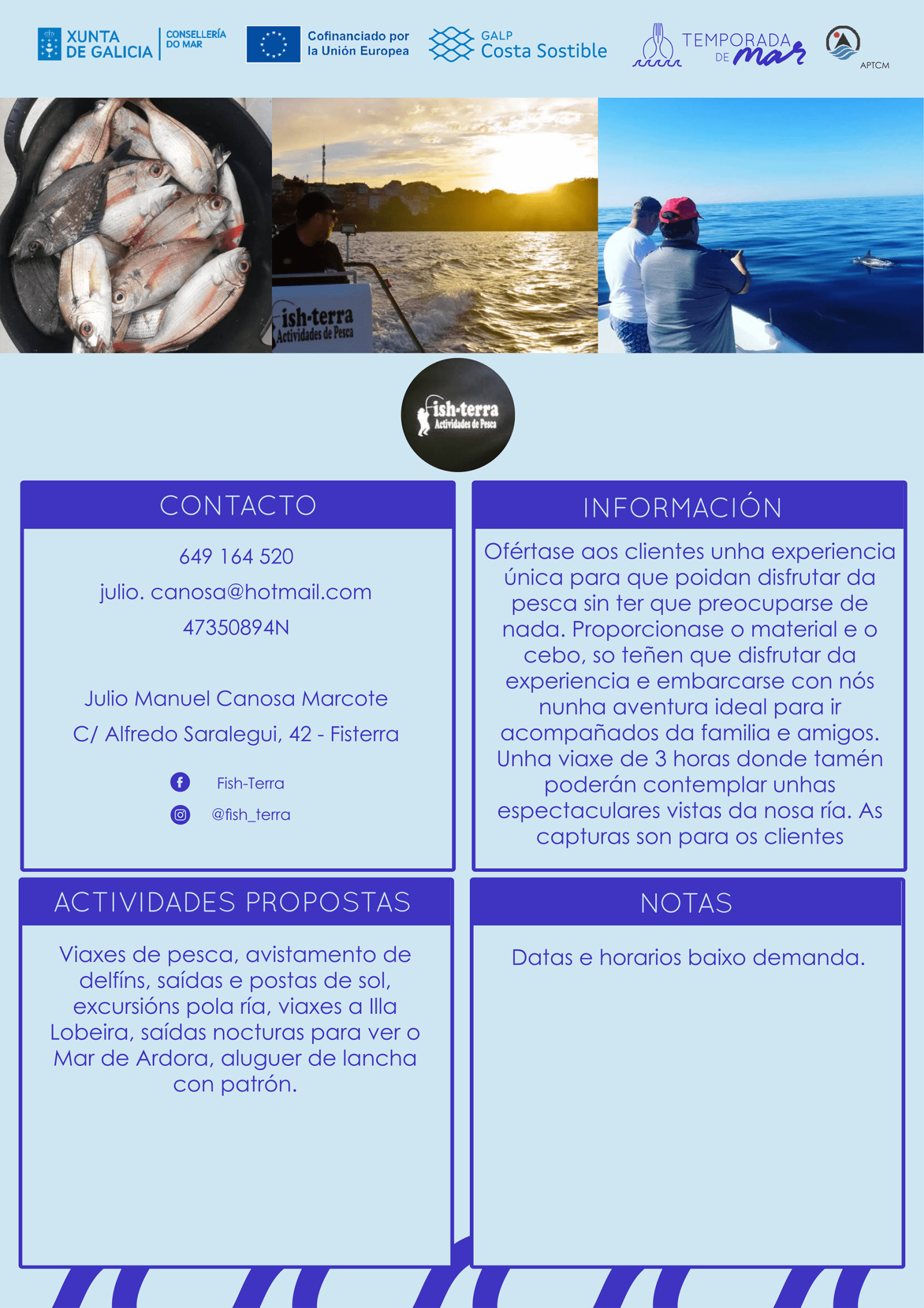 • Ofértase ós clientes unha experiencia única para que poidan disfrutar da pesca sen ter que preocuparse de nada. Proporciónase o material e o cebo, só teñen que desfrutar da experiencia e embarcarse con nós nunha aventura ideal para ir acompañados da familia e amigos.
